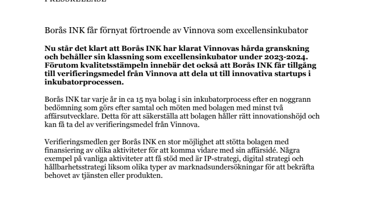 Nu står det klart att Borås INK har klarat Vinnovas hårda granskning och behåller sin klassning som excellensinkubator under 2023-2024. Förutom kvalitetsstämpeln innebär det också att Borås INK får tillgång till verifieringsmedel från Vinnova att dela ut till innovativa startups i inkubatorprocessen.