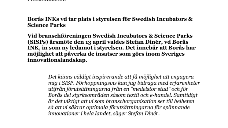 Vid branschföreningen Swedish Incubators & Science Parks (SISPs) årsmöte den 13 april valdes Stefan Dinér, vd Borås INK, in som ny ledamot i styrelsen. Det innebär att Borås har möjlighet att påverka de insatser som görs inom Sveriges innovationslandskap.