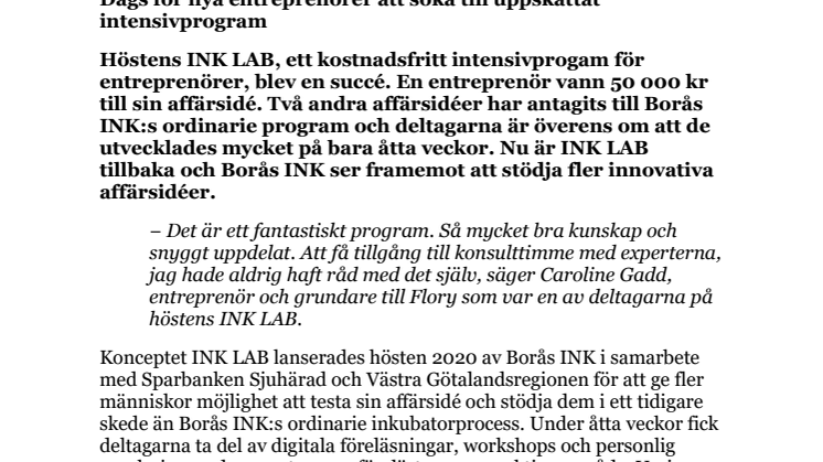Höstens INK LAB, ett kostnadsfritt intensivprogam för entreprenörer, blev en succé. En entreprenör vann 50 000 kr till sin affärsidé. Två andra affärsidéer har antagits till Borås INK:s ordinarie program och deltagarna är överens om att de utvecklades mycket på bara åtta veckor. Nu är INK LAB tillbaka och Borås INK ser framemot att stödja fler innovativa affärsidéer.
