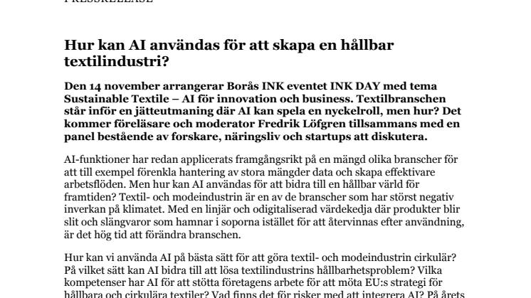 Den 14 november arrangerar Borås INK eventet INK DAY med tema Sustainable Textile – AI för innovation och business. Textilbranschen står inför en jätteutmaning där AI kan spela en nyckelroll, men hur? Det kommer föreläsare och moderator Fredrik Löfgren tillsammans med en panel bestående av forskare, näringsliv och startups att diskutera.