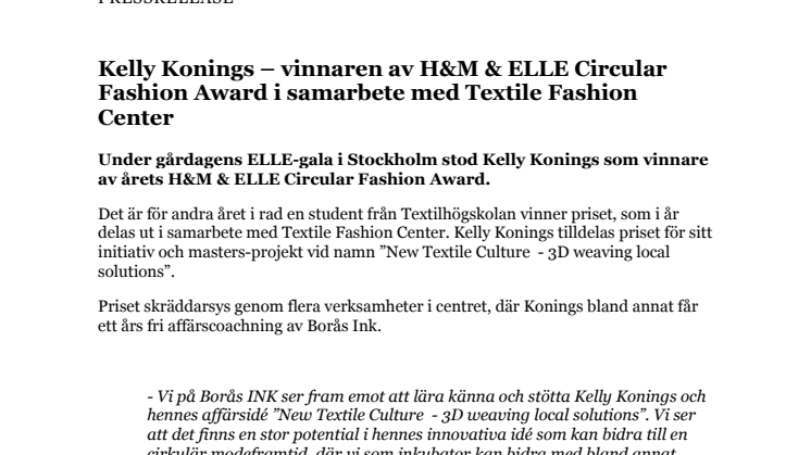 Det är för andra året i rad en student från Textilhögskolan vinner priset, som i år delas ut i samarbete med Textile Fashion Center. Kelly Konings tilldelas priset för sitt initiativ och masters-projekt vid namn ”New Textile Culture - 3D weaving local solutions”.