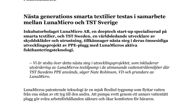 – Vi är stolta över detta nästa steg i utvecklingsprojektet, som inkluderar utvärdering av LunaMicros textilpump i de utmanande vattenstrålemiljöer där TST Swedens PPE används, säger Nate Robinson, VD och grundare av LunaMicro.