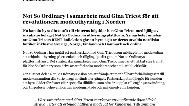 Not So Ordinary har ingått ett partnerskap med Gina Tricot som möjliggör för modekedjan att erbjuda uthyrning på ett enkelt och tillgängligt sätt genom Not so Ordinarys plattformstjänst. Det strategiska samarbetet med Gina Tricot innebär ett viktigt steg framåt för Not So Ordinary som drivs av att förändra modebranschen till att bli cirkulär.