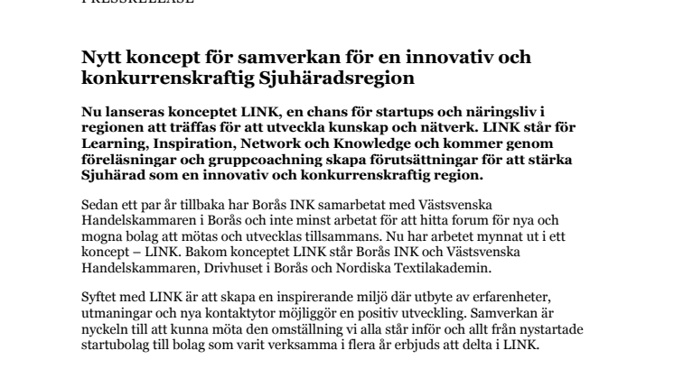 Nu lanseras konceptet LINK, en chans för startups och näringsliv i regionen att träffas för att utveckla kunskap och nätverk. LINK står för Learning, Inspiration, Network och Knowledge och kommer genom föreläsningar och gruppcoachning skapa förutsättningar för att stärka Sjuhärad som en innovativ och konkurrenskraftig region.