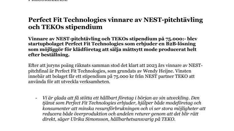 Vinnare av NEST-pitchtävling och TEKOs stipendium på 75.000:- blev startupbolaget Perfect Fit Technologies som erbjuder en B2B-lösning som möjliggör för klädföretag att sälja måttsytt mode producerat helt efter beställning.