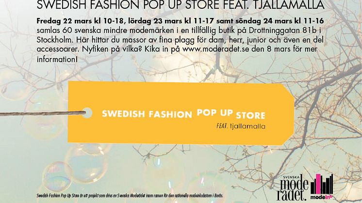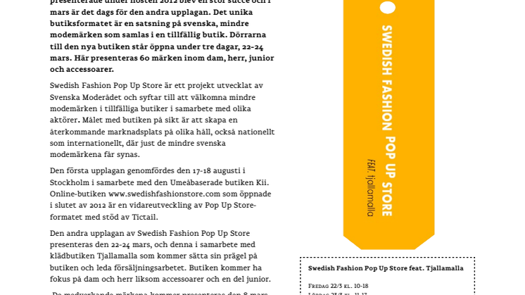 Den andra upplagan av Swedish Fashion Pop Up Store presenteras den 22-24 mars, och denna i samarbete med klädbutiken Tjallamalla som kommer sätta sin prägel på butiken och leda försäljningsarbetet. Butiken kommer ha fokus på dam och herr liksom accessoarer och en del junior.