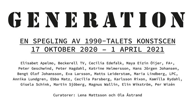 Utställningen Generation har ambitionen att överraska och ge en ingång till den period i svensk konsthistoria som föregick millennieskiftet. Det finns åtskilligt i 90-talets konstliv som påminner om hur nutidens konstscen ser ut och många namn är fortfarande aktiva. Det finns också betydande skillnader mellan då och nu, fram till dess hade konsthistorien exempelvis dominerats av män, detta ändrades verkligen under 90-talet. Det fanns också en befriande ”fuck you-attityd” och kanske var 90-talet det sista oskuldsfulla årtiondet, innan internet och sociala medier gjorde allting genomlyst och sökbart. Under den här tiden återuppstod en idealism och upprorsanda som påminde mycket om punkens vilja att provocera. Det fanns under dessa år såväl en nyvunnen konstnärlig frihet som ett utbrett ifrågasättande av hur ett konstverk bör se ut och vad konst kan vara.