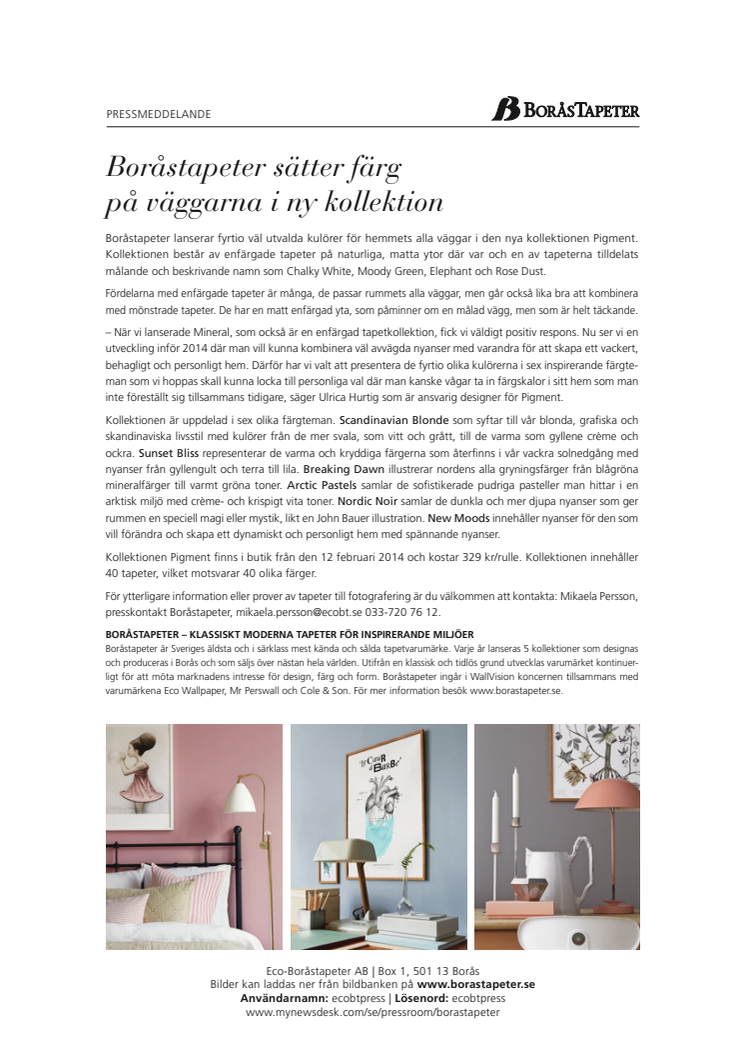 Boråstapeter lanserar fyrtio väl utvalda kulörer för hemmets alla väggar i den nya kollektionen Pigment. Kollektionen består av enfärgade tapeter på naturliga, matta ytor där var och en av tapeterna tilldelats målande och beskrivande namn som Chalky White, Moody Green, Elephant och Rose Dust.