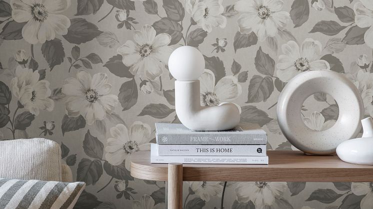 Den behagligt dämpade färgskalan går i naturliga nyanser, från cremevitt och blekrosa till dova toner av antracitgrått och midnattsblått. Här finns mjuka, organiska former som bladverk och blommor, men också enfärgade tapeter och inslag av folklore och geometri. 30 mångsidiga tapeter för en lugnare, skönare vardag.