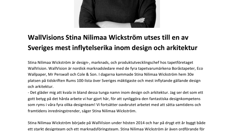 • ​WallVisions Stina Nilimaa Wickström utses till en av Sveriges mest inflytelserika inom design och arkitektur