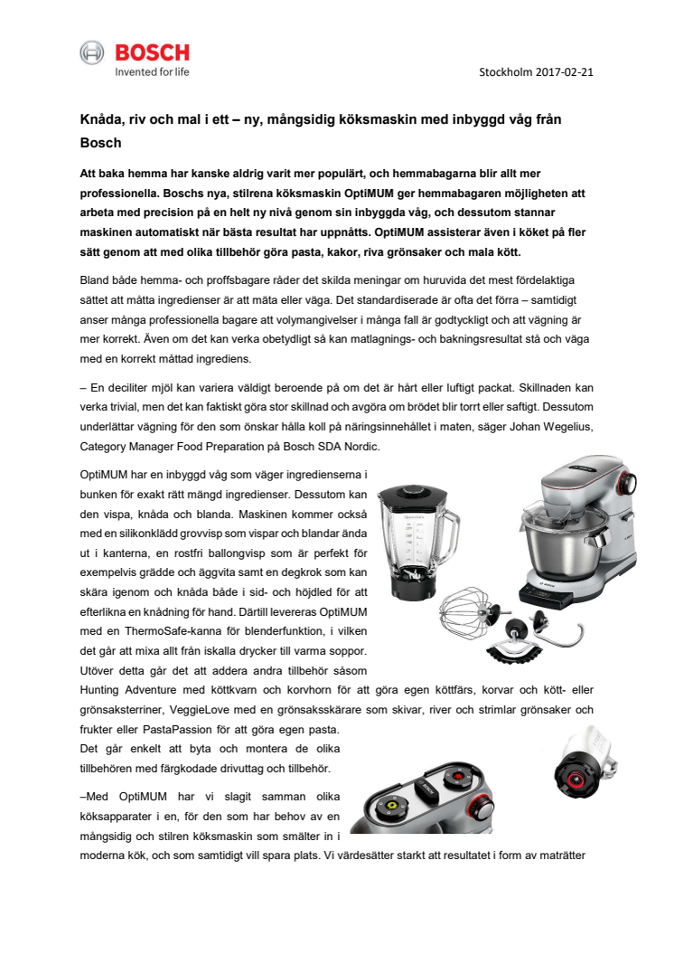 Att baka hemma har kanske aldrig varit mer populärt, och hemmabagarna blir allt mer professionella. Boschs nya, stilrena köksmaskin OptiMUM ger hemmabagaren möjligheten att arbeta med precision på en helt ny nivå genom sin inbyggda våg, och dessutom stannar maskinen automatiskt när bästa resultat har uppnåtts.