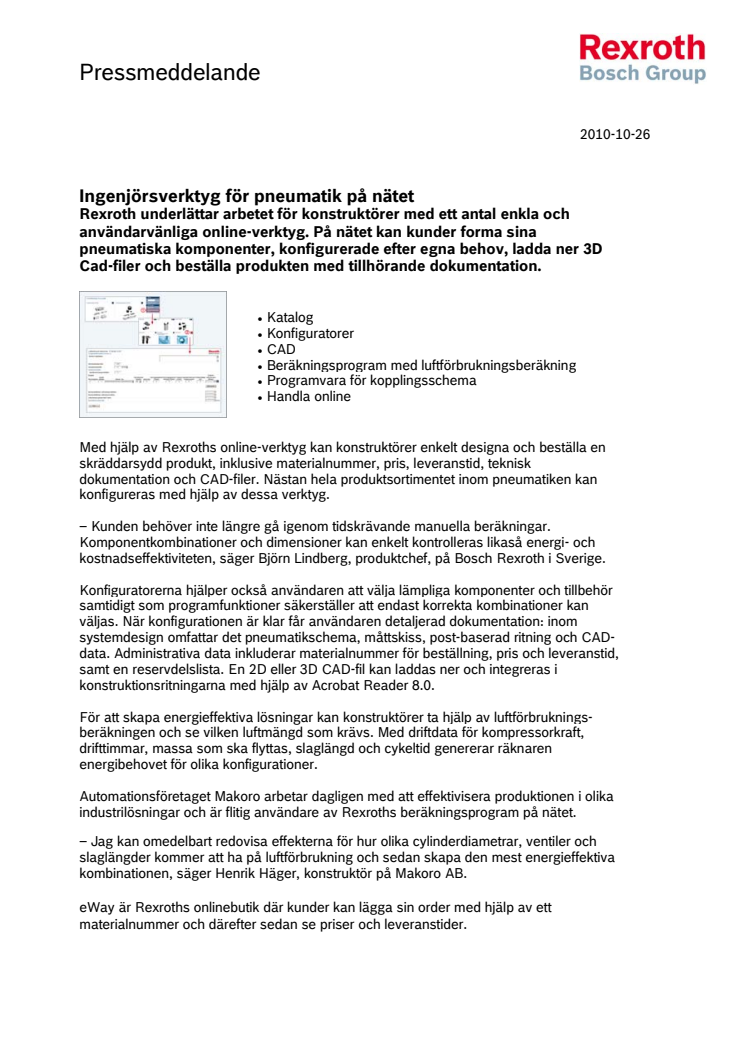Rexroth underlättar arbetet för konstruktörer med ett antal enkla och användarvänliga online-verktyg. På nätet kan kunder forma sina pneumatiska komponenter, konfigurerade efter egna behov, ladda ner 3D Cad-filer och beställa produkten med tillhörande dokumentation.