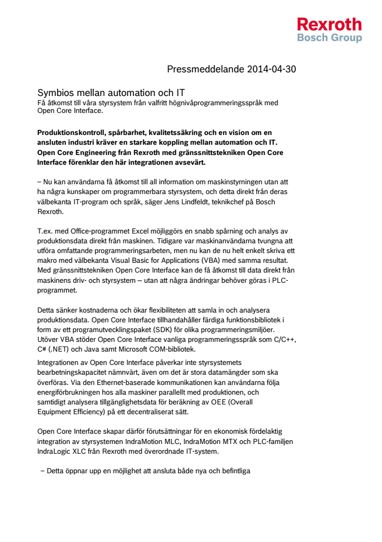Produktionskontroll, spårbarhet, kvalitetssäkring och en vision om en ansluten industri kräver en starkare koppling mellan automation och IT. Open Core Engineering från Rexroth med gränssnittstekniken Open Core Interface förenklar den här integrationen avsevärt.