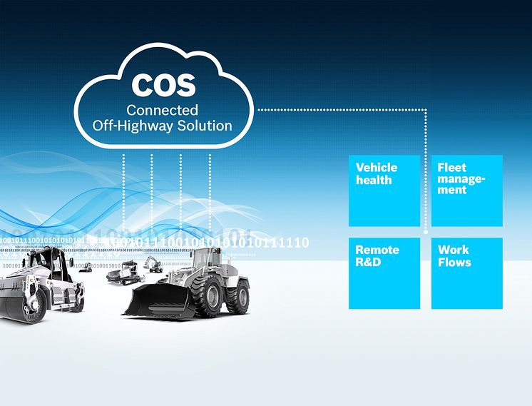 Internet of Things (IoT) blir allt viktigare för mobila maskiner. Trots detta finns det en brist på helhetslösningar, speciellt när det kommer till byggmaskiner som kombinerar en tillförlitlig, global IT-infrastruktur som uppfyller relevant lagstiftning med områdesspecifika krav. Detta ändras nu med lanseringen av Connected Off-Highway Solution, utvecklad av Bosch Rexroth tillsammans med partners från Bosch Group. Tack vare detta samarbete kan Bosch Rexroth dra nytta av gruppens stora erfarenhet av massproduktionsskalning och global implementering av IoT. Fram till 2020 kommer Bosch IoT Suite att växa från 3 miljoner till som minst 12 miljoner anslutna fordon.