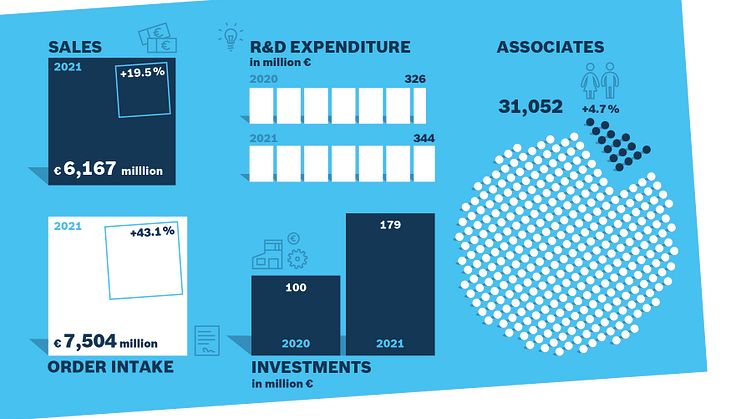 Försäljningstillväxten för 2021 ökade markant med en tvåsiffrig tillväxt i samtliga regioner i världen. I Europa, Tyskland undantaget, uppnådde Bosch Rexroth den största årliga tillväxttakten någonsin på hela 23,5 procent. Försäljningen uppgick där till två miljarder euro. I Tyskland ökade försäljningen 18,2 procent till 1,3 miljarder euro. I Nord- och Sydamerika ökade försäljningen med 18,3 procent till 1,1 miljard euro, och i Asien med 15,9 procent till 1,8 miljarder euro. Den totala försäljningen på 6,2 miljarder euro är nu tillbaka på 2019 års nivåer, det vill säga året innan pandemin bröt ut.