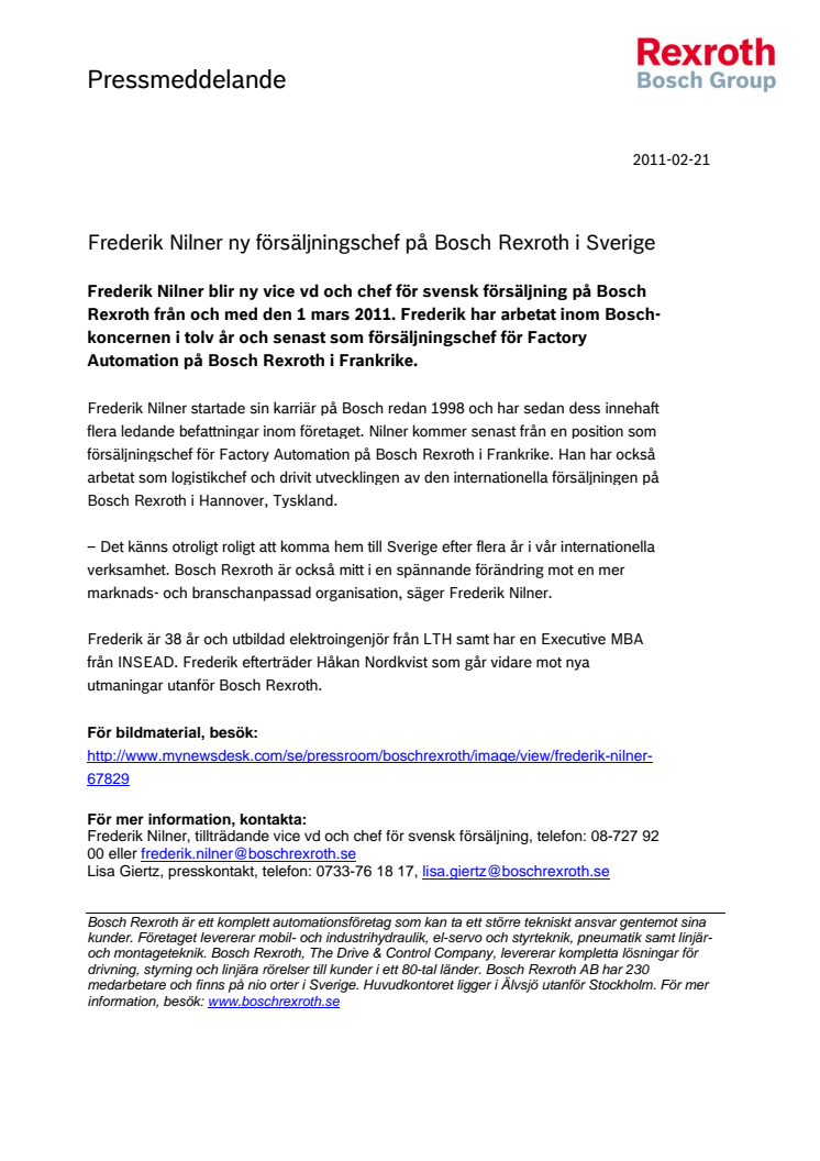 Frederik Nilner blir ny vice vd och chef för svensk försäljning på Bosch Rexroth från och med den 1 mars 2011. Frederik har arbetat inom Bosch-koncernen i tolv år och senast som försäljningschef för Factory Automation på Bosch Rexroth i Frankrike.