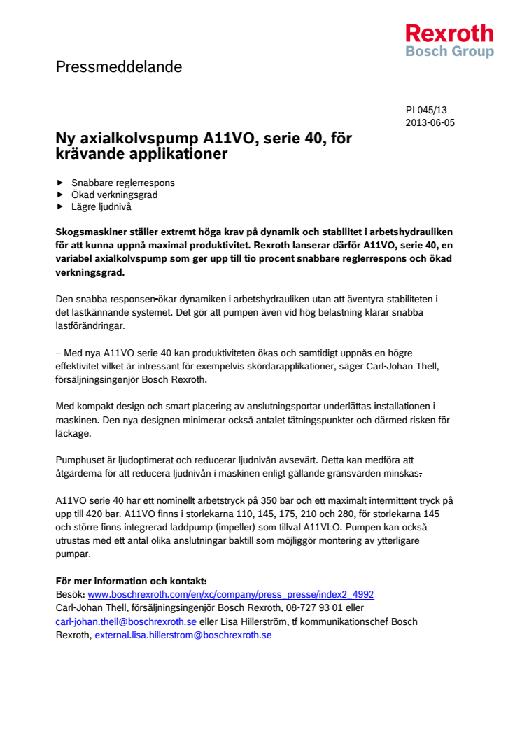 Carl-Johan Thell, försäljningsingenjör Bosch Rexroth, 08-727 93 01 eller carl-johan.thell@boschrexroth.se eller Lisa Hillerström, tf kommunikationschef Bosch Rexroth, external.lisa.hillerstrom@boschrexroth.se