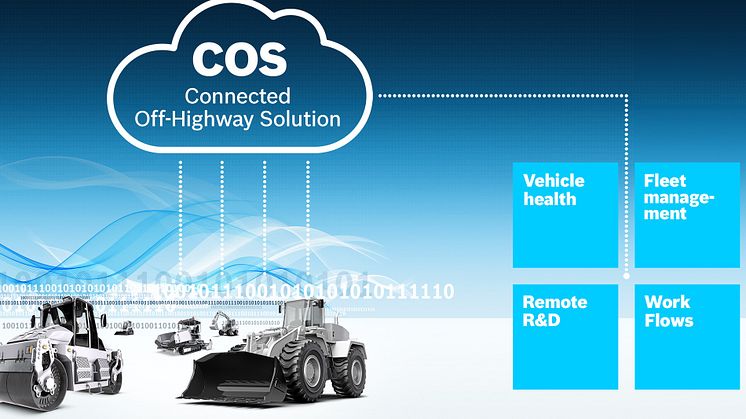 Internet of Things (IoT) blir allt viktigare för mobila maskiner. Trots detta finns det en brist på helhetslösningar, speciellt när det kommer till byggmaskiner som kombinerar en tillförlitlig, global IT-infrastruktur som uppfyller relevant lagstiftning med områdesspecifika krav. Detta ändras nu med lanseringen av Connected Off-Highway Solution, utvecklad av Bosch Rexroth tillsammans med partners från Bosch Group. Tack vare detta samarbete kan Bosch Rexroth dra nytta av gruppens stora erfarenhet av massproduktionsskalning och global implementering av IoT. Fram till 2020 kommer Bosch IoT Suite att växa från 3 miljoner till som minst 12 miljoner anslutna fordon.