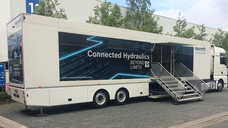 Lastbilen är ett 17 meter långt showroom på hjul med de senaste produkterna inom uppkopplad hydraulik från Bosch Rexroth. Fokus ligger på konceptet Connected Hydraulics, där hydraulikprodukter kombineras med smart mjukvara. Det är lösningar som banar väg för Industri 4.0.