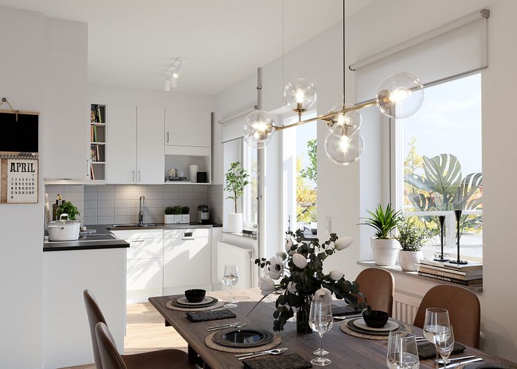 Köket ligger i lägenhetens ena del, med ljusinsläpp och balkong