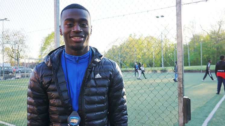 Vid fotbollsplanen på Sandspåret står Adil Titi, en av ledarna i Angered IS, som till vardags spelar i IFK Göteborgs A-lag. Han coachar både ledare och spelare från sidan om planen och påminner om att prata med varandra och att hålla avstånd.