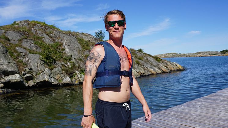 Fritidsledaren Johan Fridehäll är extra glad. Han är nyutexaminerad och fick fast jobb veckan innan lägret startade. Nu pekar han på en osynlig gräns på bryggan – gränsen för flytväst.