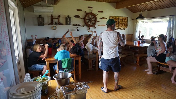 Johnny, som är ansvarig ledare ihop med Satu, får tyst i kabyssen innan lunchen.