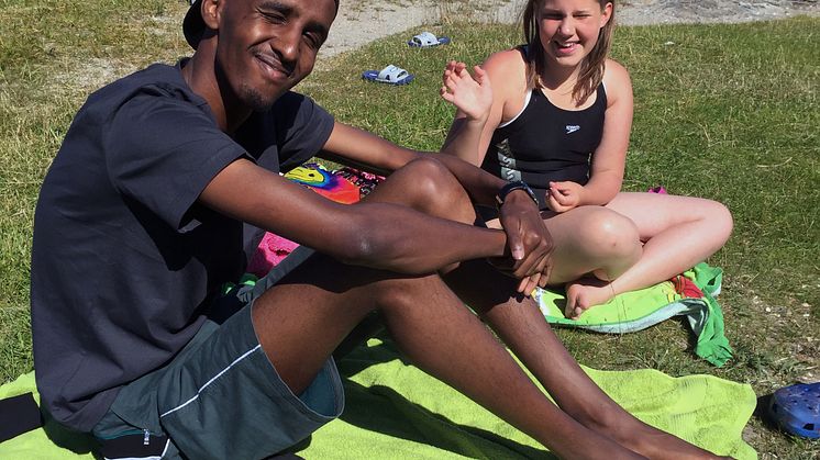 Adan Farah, som är stadsdelsvärd i Östra Göteborg, sitter och pratar i gräset med Isabell, som bor på Tisdagsgatan i Kortedala och stortrivs på lägret– hon är här för tredje gången. Adan njuter av att vara på Brännö, idag är det han som är ansvarig för lunchen. Hemma i Östra Göteborg känner han alla.