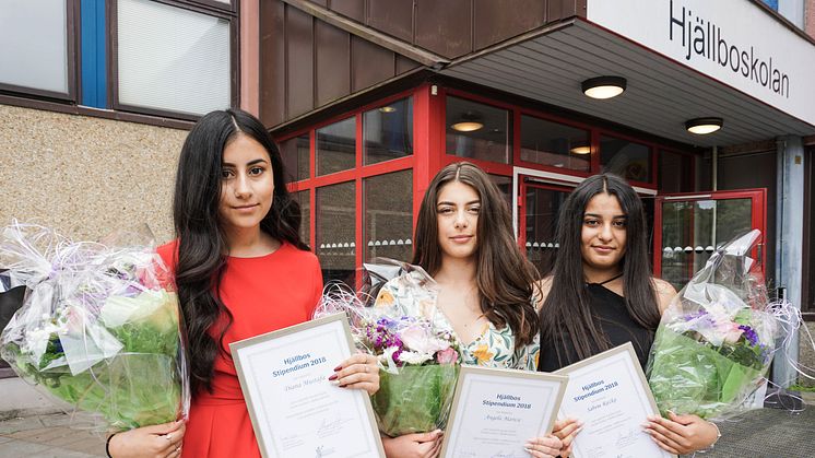 I år har nästan alla i årskurs nio på Hjällboskolan höjt sina betyg från förra året. Några som kämpat extra hårt är Diana Mustafa, Angela Maricic och Sabrin Razko, som tillsammans fick gå upp Hjällboskolans scen och ta emot var sitt stipendium för mycket goda studieresultat. Tillsammans får de dela på 10 000 kronor och de vet vad de ska göra för pengarna.