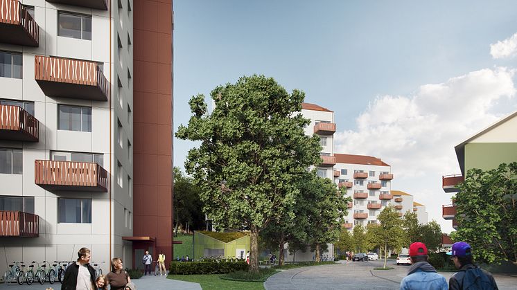 Det nya byggprojektet i Kortedala håller en hög svansföring med sitt genomtänkta färg- och formspråk. Entréerna blir inbjudande, balkongräckena flirtar öppet med 50-talet och miljöhusen får sedumtak och fasader i tre nyanser av grönt. I området tillförs gemensamma uteplatser med fasta bord och stolar samt grill- och lekytor.