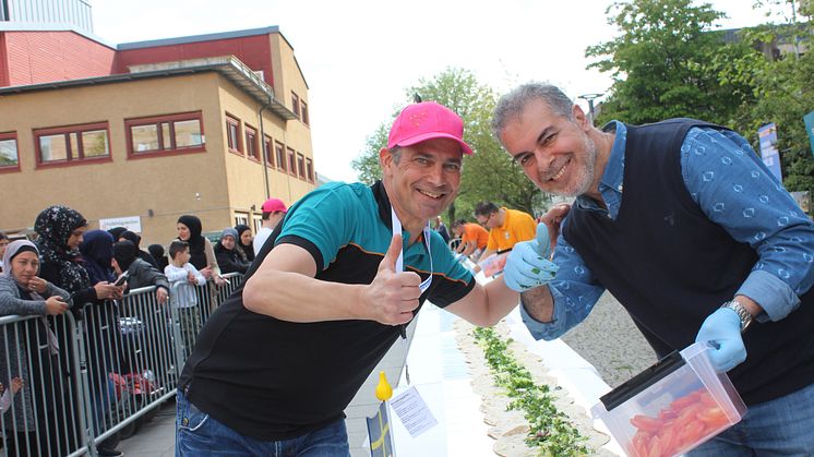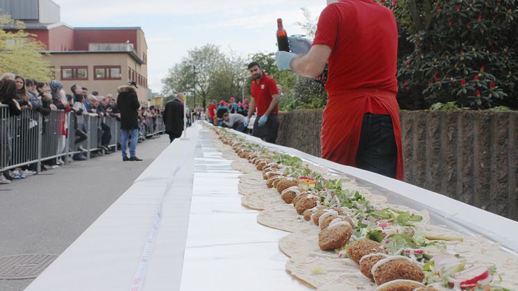 500 bitar av falafelrullen delades snabbt ut till de Hjällbobor och andra göteborgare som väntade på att få smaka på världsrekordet.
