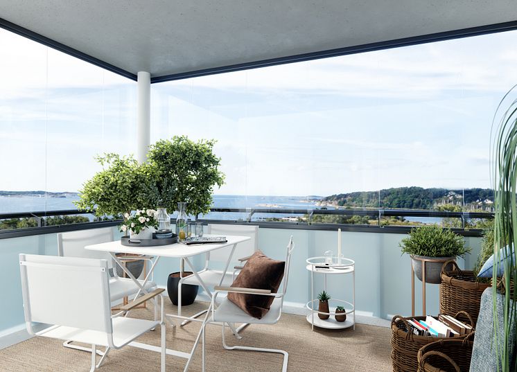 Många av balkongerna är inglasade och har panoramautsikt över Askimsviken.