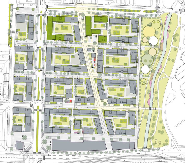I augusti 2011 sker byggstarten för Bostadsbolagets 200 hyresrätter i den nya centrala stadsdelen Kvillebäcken. Illustrationen visar hela stadsdelen med Bostadsbolagets fastigheter utmärkta i grönt.
