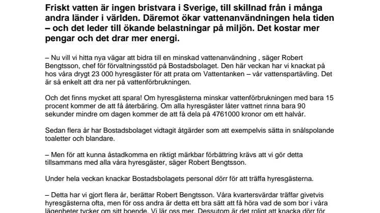 – Nu vill vi hitta nya vägar att bidra till en minskad vattenanvändning , säger Robert Bengtsson, chef för förvaltningsstöd på Bostadsbolaget. Den här veckan har vi knackat på hos våra drygt 23 000 hyresgäster för att prata om Vattentanken – vår vattenspartävling. Det är så enkelt att dra ner på vattenförbrukningen.