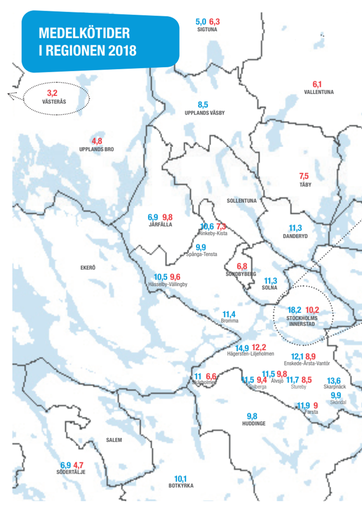 Medelkötider för förmedlade bostäder i regionen 2018 (karta)