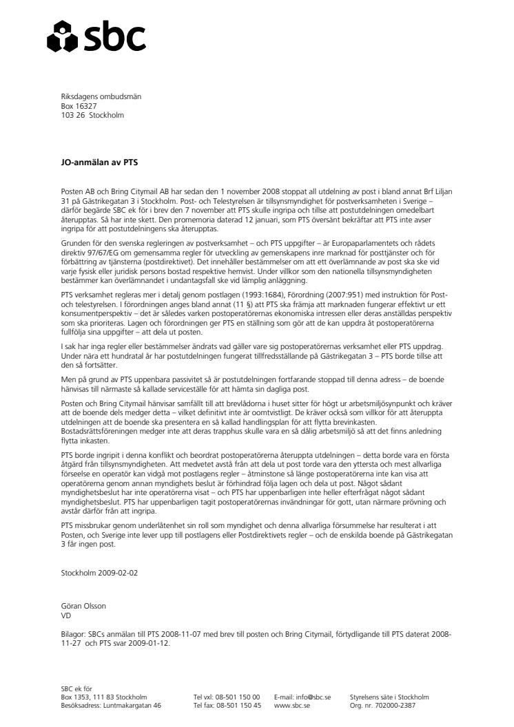 Bostadsrättsföreningar rättslösa när postutdelning stoppas. SBC anmäler PTS till JO