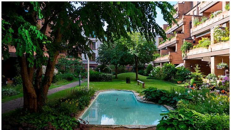 Brf Humle 24 har förutom en prunkande växtlighet även porlande vatten och en härlig granngemenskap.