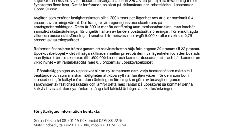 – Vi ger regeringen både ros och ris. Självklart välkomnar vi sänkningen av fastighetsskatten, säger Göran Olsson, VD för bostadsrättsorganisationen SBC. Våra principiella invändningar mot flyttskatten finns kvar. Det är fortfarande en skatt på skilsmässor och arbetslöshet, konstaterar Göran Olsson.