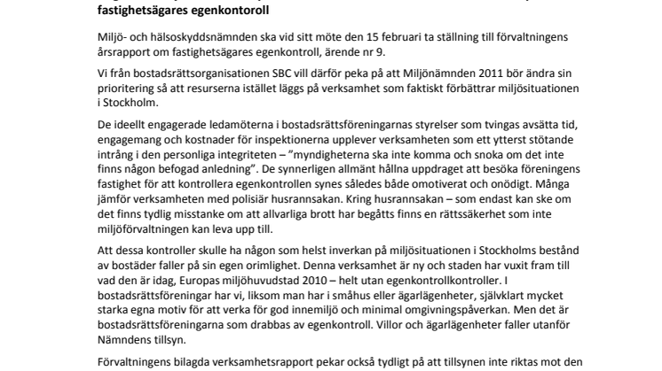 Miljö- och hälsoskyddsförvaltningen i Stockholm stad utför sedan några år inspektioner hos bostadsrättsföreningar för att kontrollera att dessa utför sin egenkontroll. På tisdag tar Miljö- och hälsoskyddsnämnden beslut om tillsynen ska utökas till att miljöinspektören även ska ta sig in i enskilda bostäder. Bostadsrättsorganisationen SBC har därför skrivit brev till ledamöterna i nämnden för att påtala det orimliga i denna tillsyn, något som många beskriver som husrannsakningar.