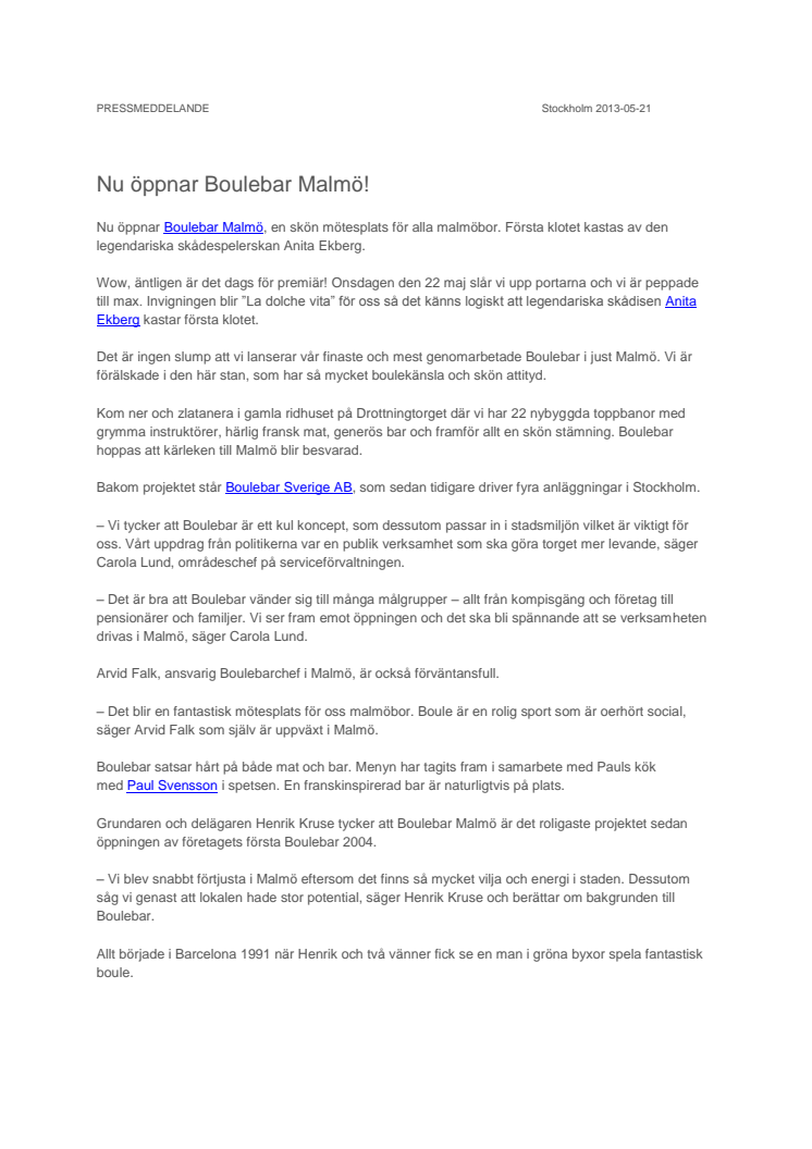 Onsdagen den 22 maj öppnar Boulebar Malmö. Första klotet kastas av den legendariska skådespelerskan Anita Ekberg.
