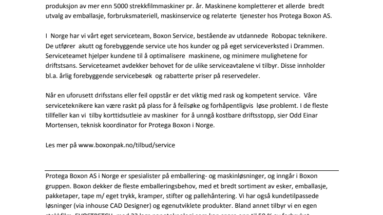 Når en uforusett drifsstans eller feil oppstår er det viktig med rask og kompetent service. Våre serviceteknikere kan være raskt på plass for å feilsøke og forhåpentligvis løse problemt. I de fleste tillfeller kan vi tilby korttidsutleie av maskiner for å unngå kostbare driftsstopp, sier Odd Einar Mortensen, teknisk koordinator for Protega Boxon i Norge. Les mer på www.boxonpak.no/tilbud/service