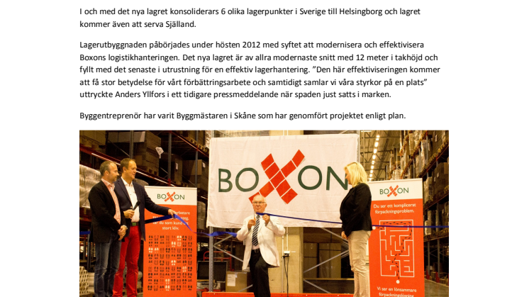 Lagerutbyggnaden påbörjades under hösten 2012 med syftet att modernisera och effektivisera Boxons logistikhanteringen. Det nya lagret är av allra modernaste snitt med 12 meter i takhöjd och fyllt med det senaste i utrustning för en effektiv lagerhantering. ”Den här effektiviseringen kommer att få stor betydelse för vårt förbättringsarbete och samtidigt samlar vi våra styrkor på en plats” uttryckte Anders Yllfors i ett tidigare pressmeddelande när spaden just satts i marken.