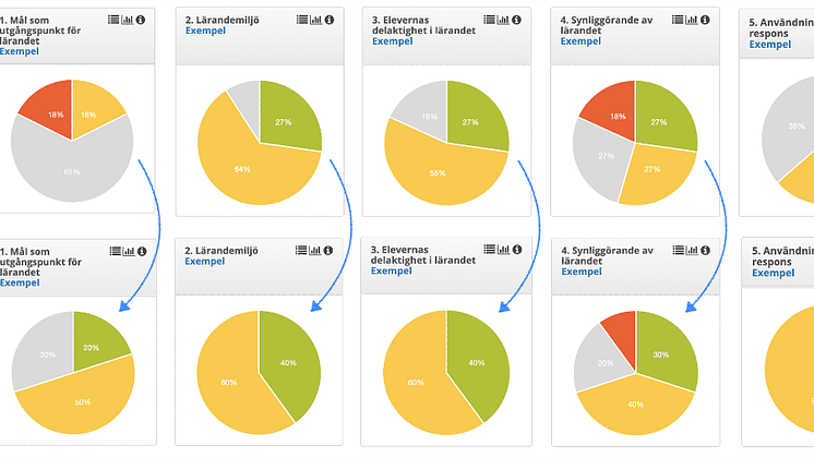 Just de graferna visar utvecklingen för dimensionerna: Mål som utgångspunkt för lärande, Lärandemiljö, Elevernas delaktighet i lärandet, Synliggörande av lärandet och Användning av respons för lärande. Varje skola/kommun/organisation väljer själv vad man vill sätta fokus på.