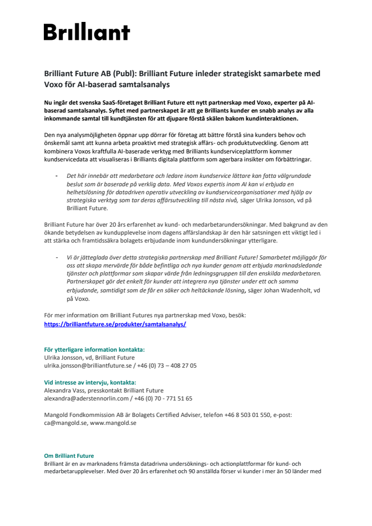 Brilliant Future AB (Publ) Brilliant Future går in i partneskap med Voxo och erbjuder AI-baserad samtalsanalys.pdf