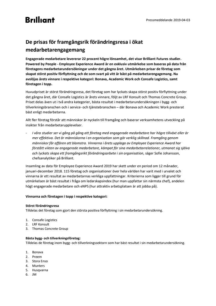 Engagerade medarbetare levererar 22 procent högre lönsamhet, det visar Brilliant Futures studier. Powered by People - Employee Experience Award är en exklusiv utmärkelse som baseras på data från företagens medarbetarundersökningar under det gångna året. Nu avslöjas årets vinnare i respektive kategori: Bonava, Academic Work och Consafe Logistics, samt företagen i topp.