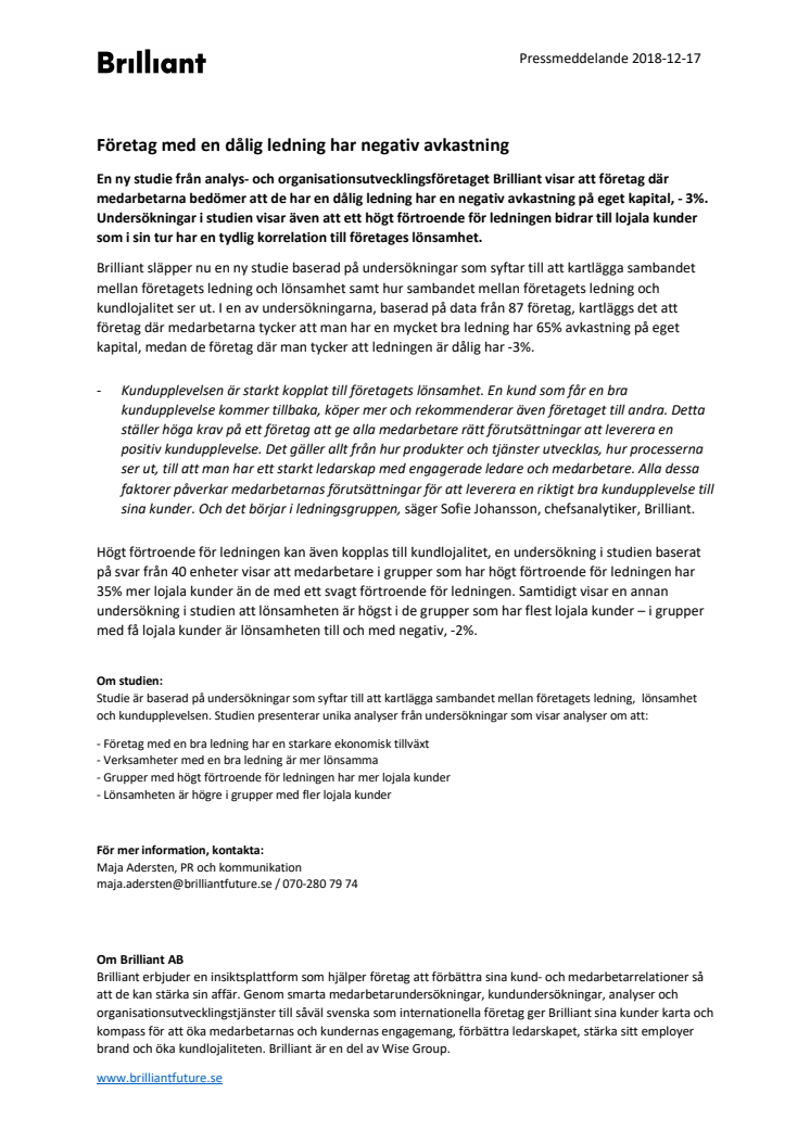 En ny studie från analys- och organisationsutvecklingsföretaget Brilliant visar att företag där medarbetarna bedömer att de har en dålig ledning har en negativ avkastning på eget kapital, - 3%. Undersökningar i studien visar även att ett högt förtroende för ledningen bidrar till lojala kunder som i sin tur har en tydlig korrelation till företages lönsamhet.