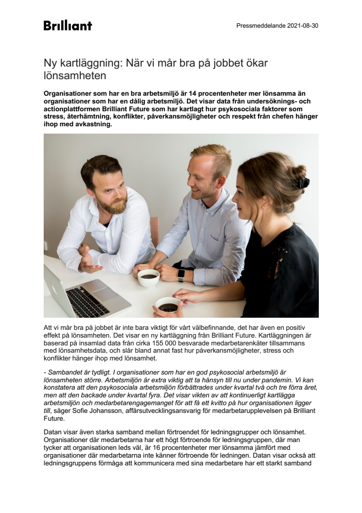 Organisationer som har en bra arbetsmiljö är 14 procentenheter mer lönsamma än organisationer som har en dålig arbetsmiljö. Det visar data från undersöknings- och actionplattformen Brilliant Future som har kartlagt hur psykosociala faktorer som stress, återhämtning, konflikter, påverkansmöjligheter och respekt från chefen hänger ihop med avkastning.