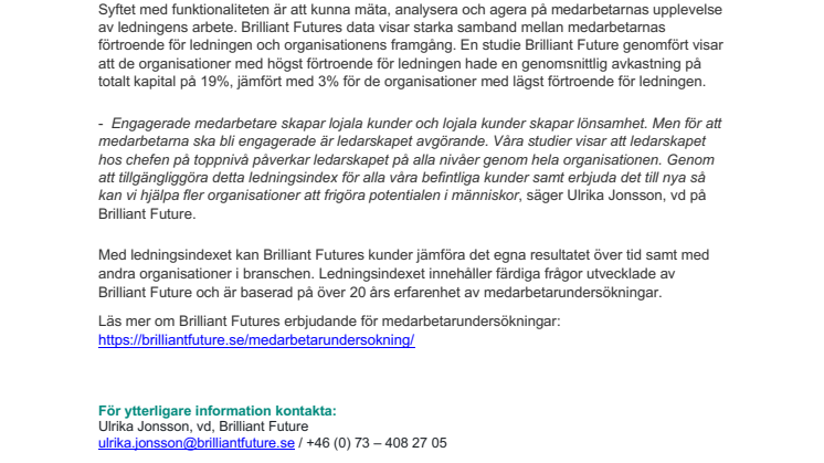 - Engagerade medarbetare skapar lojala kunder och lojala kunder skapar lönsamhet. Men för att medarbetarna ska bli engagerade är ledarskapet avgörande. Våra studier visar att ledarskapet hos chefen på toppnivå påverkar ledarskapet på alla nivåer genom hela organisationen. Genom att tillgängliggöra detta ledningsindex för alla våra befintliga kunder samt erbjuda det till nya så kan vi hjälpa fler organisationer att frigöra potentialen i människor, säger Ulrika Jonsson, vd på Brilliant Future.