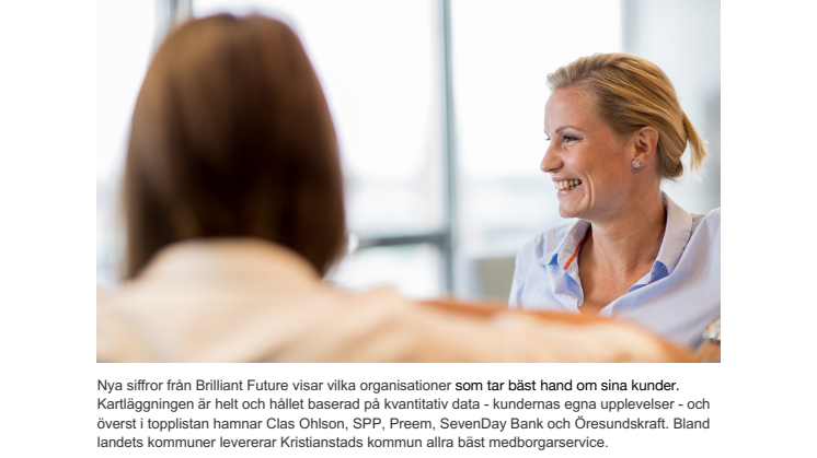 Nya siffror från Brilliant Future visar vilka organisationer som tar bäst hand om sina kunder. Kartläggningen är helt och hållet baserad på kvantitativ data - kundernas egna upplevelser - och överst i topplistan hamnar Clas Ohlson, SPP, Preem, SevenDay Bank och Öresundskraft. Bland landets kommuner levererar Kristianstads kommun allra bäst medborgarservice.