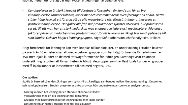 En ny studie från analys- och organisationsutvecklingsföretaget Brilliant visar att företag där medarbetarna bedömer att de har en dålig ledning har en negativ avkastning på eget kapital, - 3%. Undersökningar i studien visar även att ett högt förtroende för ledningen bidrar till lojala kunder som i sin tur har en tydlig korrelation till företages lönsamhet.